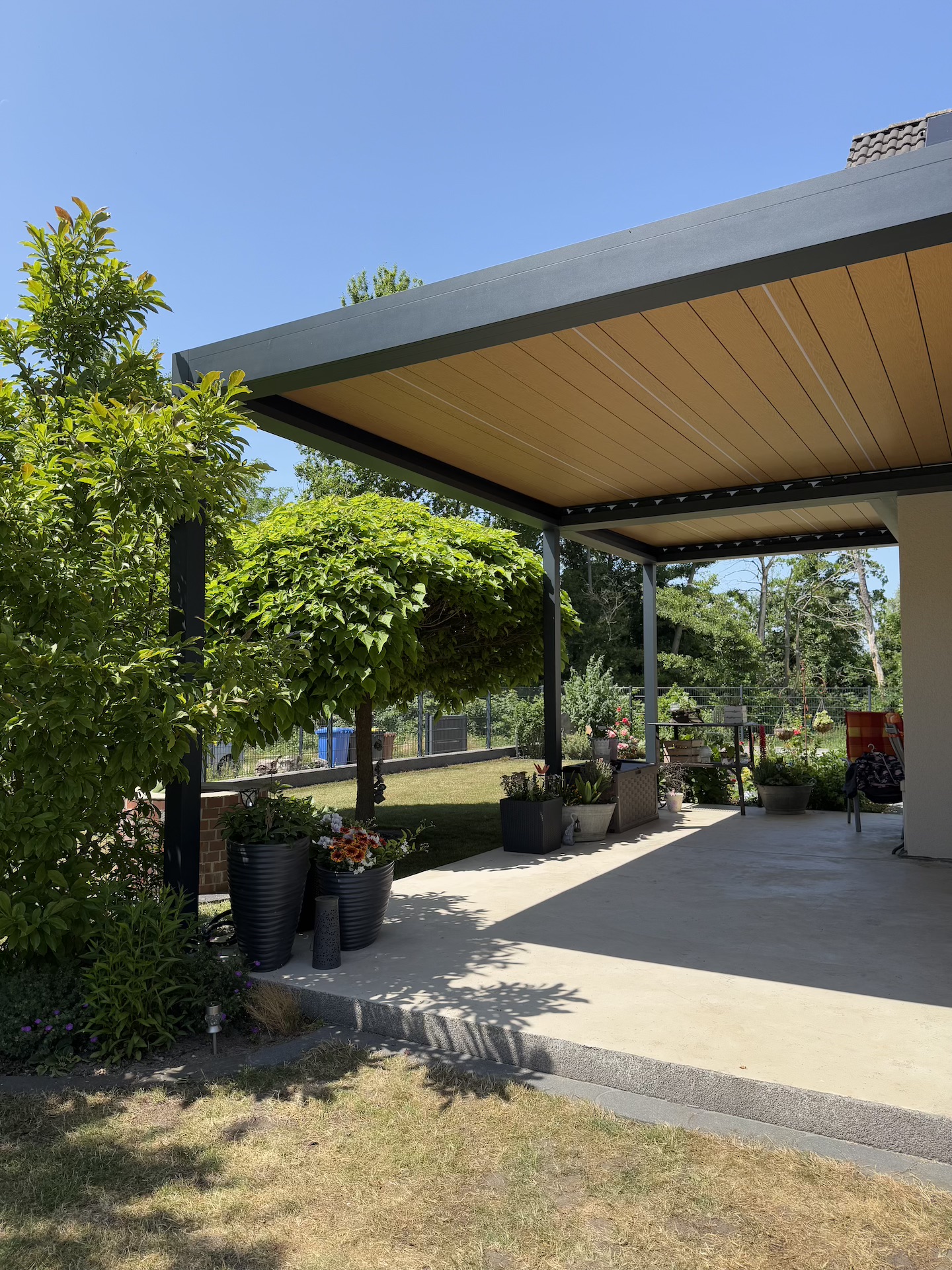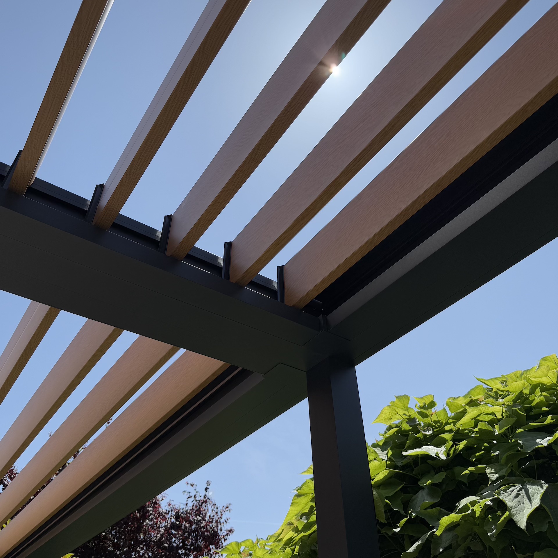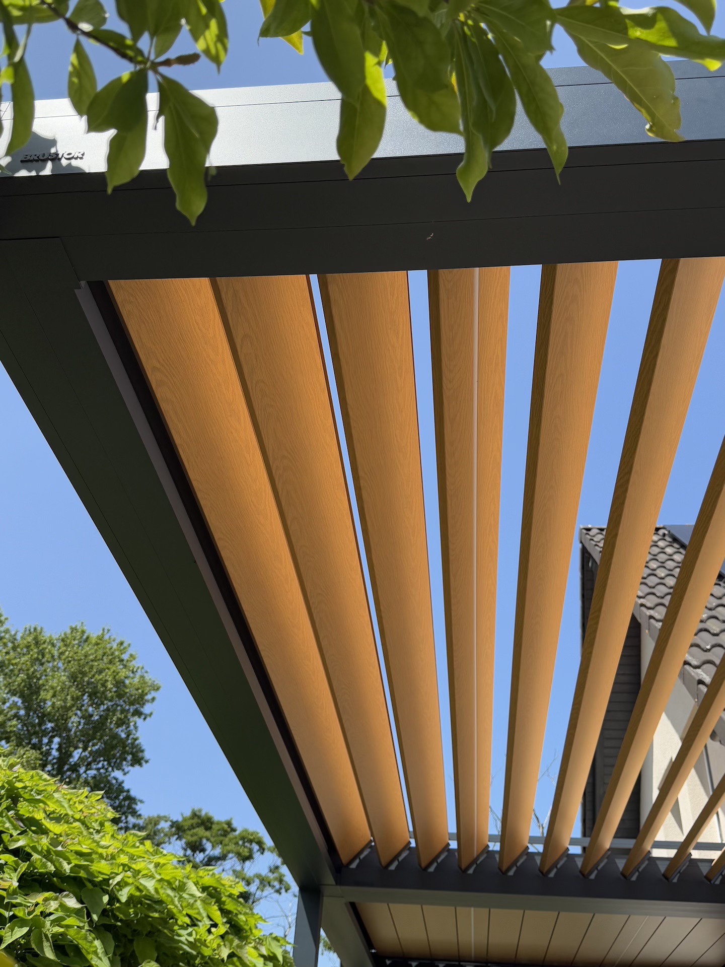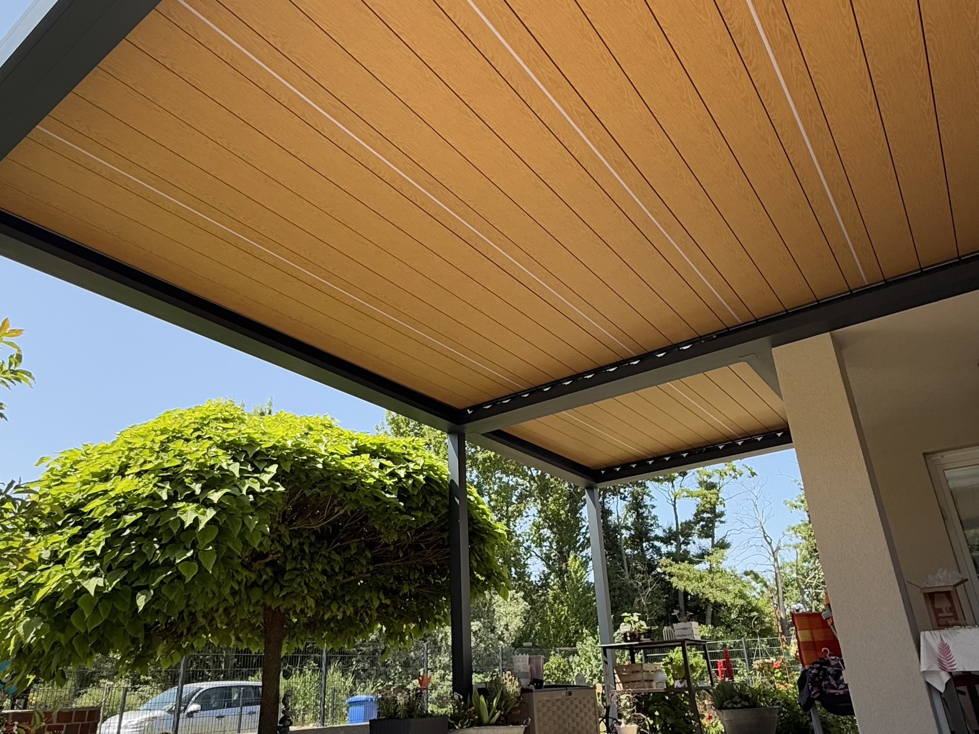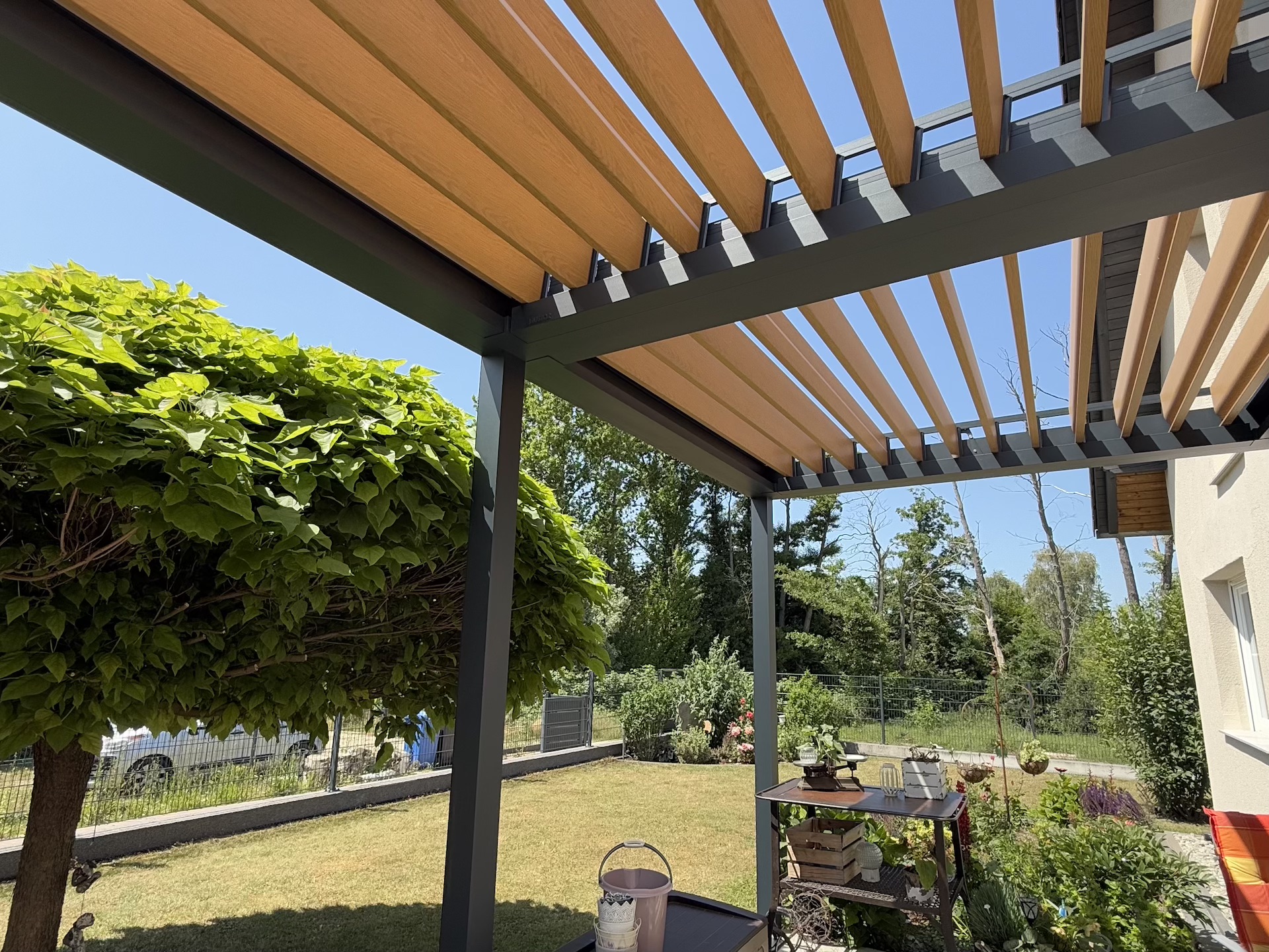 Dank dieser holzoptischen Lamellen entsteht ein einladender, gemütlicher Look, der besonders gut zu natürlichen und architektonisch modernen Umgebungen passt. Gleichzeitig bieten die drehbaren Lamellen funktionale Vorteile: Sie lassen sich öffnen, schließen oder kippen, um entweder Schatten zu spenden, gezielt Licht zuzulassen oder auch bei Regen Schutz zu gewährleisten.