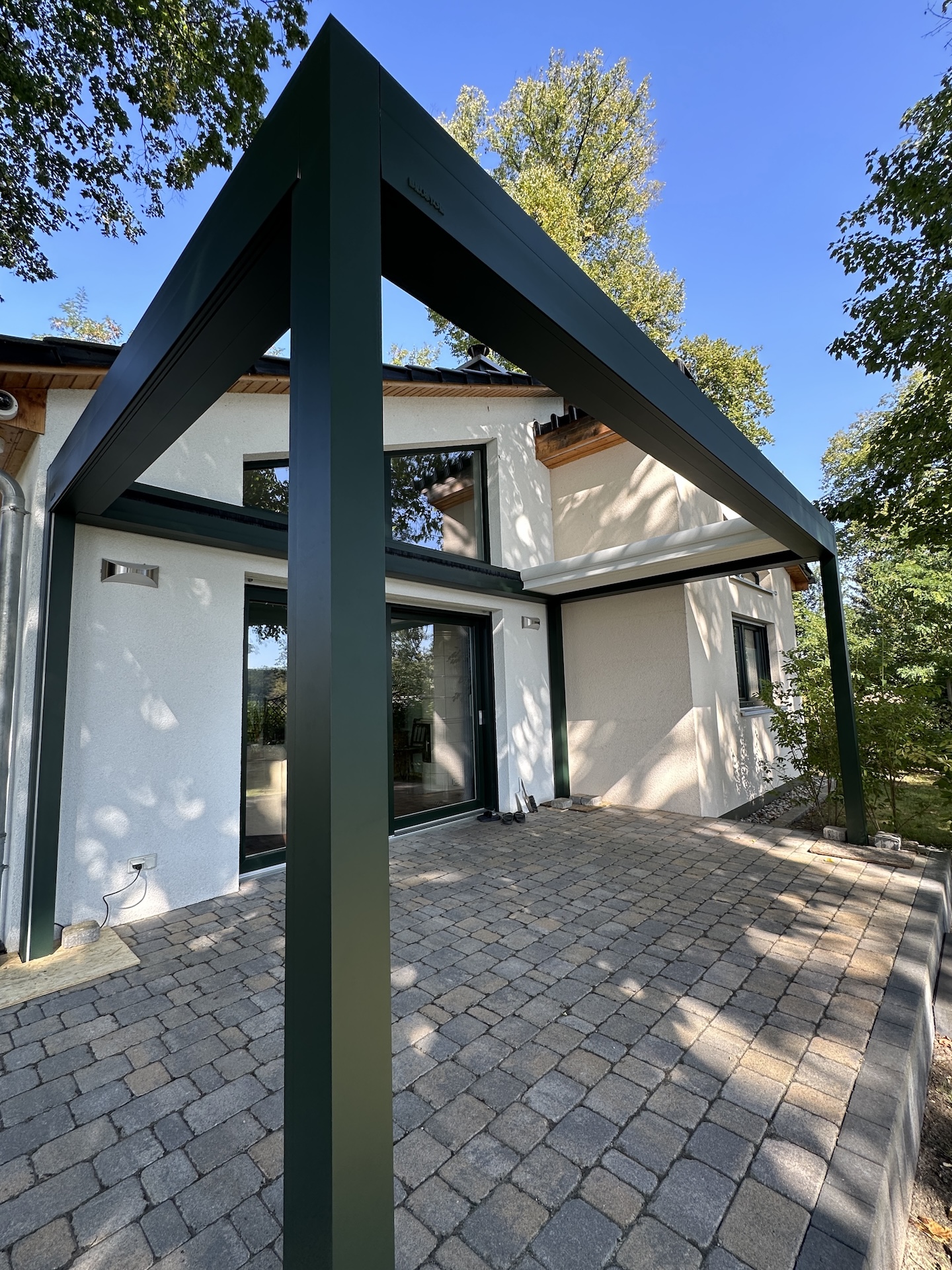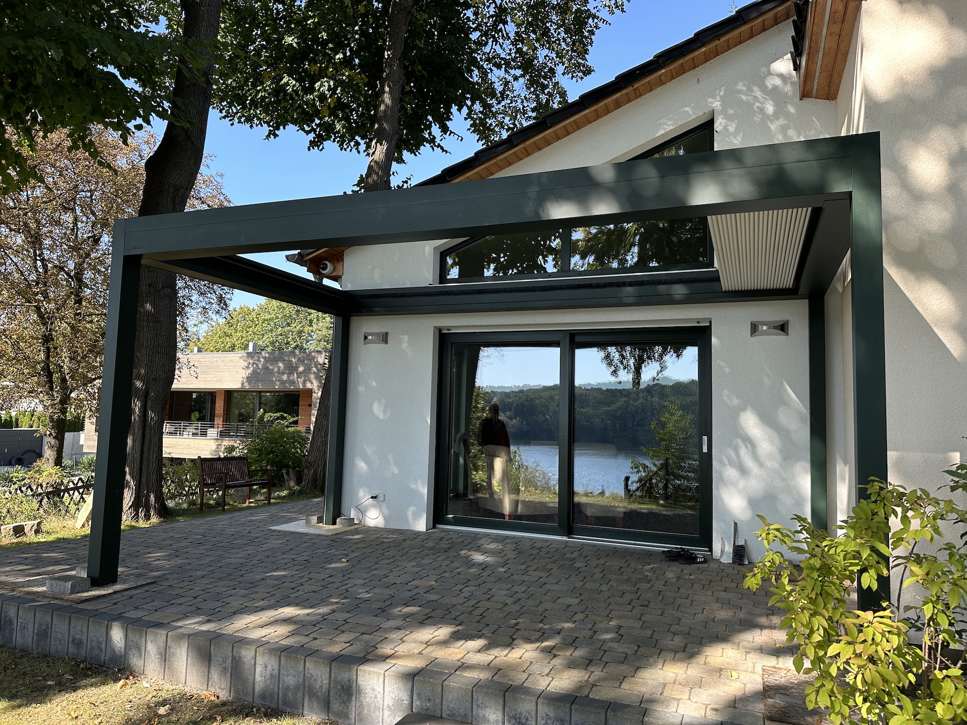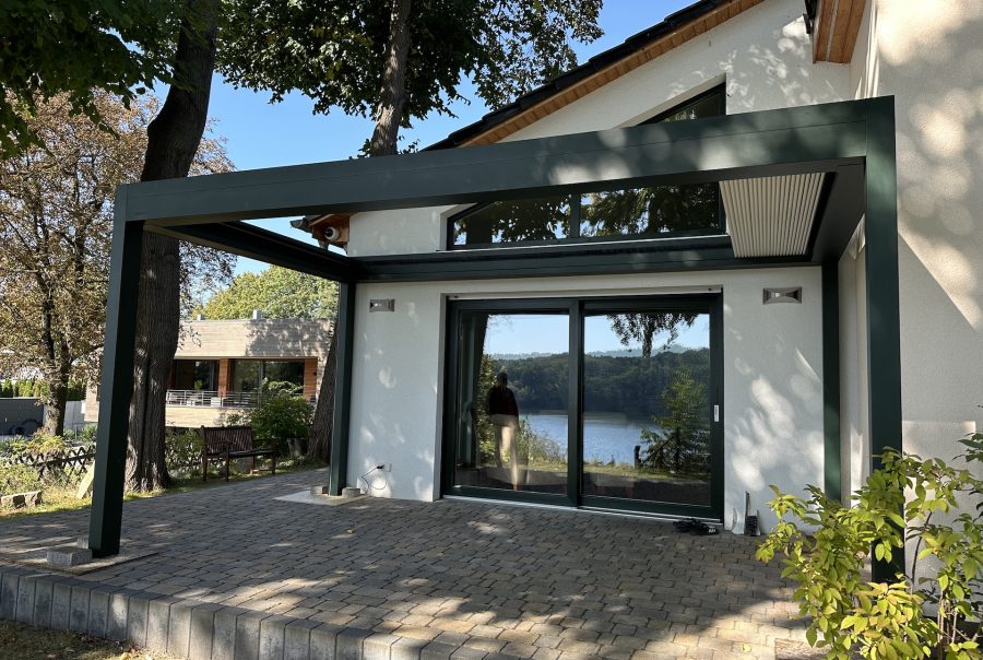 Für noch mehr Komfort kann diese Lamellen Pergola mit integrierten ZIP-Screens, dimmbarer LED-Beleuchtung sowie weiteren Ausstattungsoptionen ergänzt werden. Die Bedienung erfolgt bequem über Fernbedienung oder App, sodass sich Lamellen und Screens intuitiv steuern lassen. Durch die große Auswahl an RAL-Farben (Referenz in RAL6009 Tannengrün) und Ausführungen fügt sich die B600 S harmonisch in moderne wie klassische Architektur ein – ideal für Einfamilienhäuser, Stadtvillen oder hochwertige Außenbereiche im Raum Berlin und Brandenburg,
