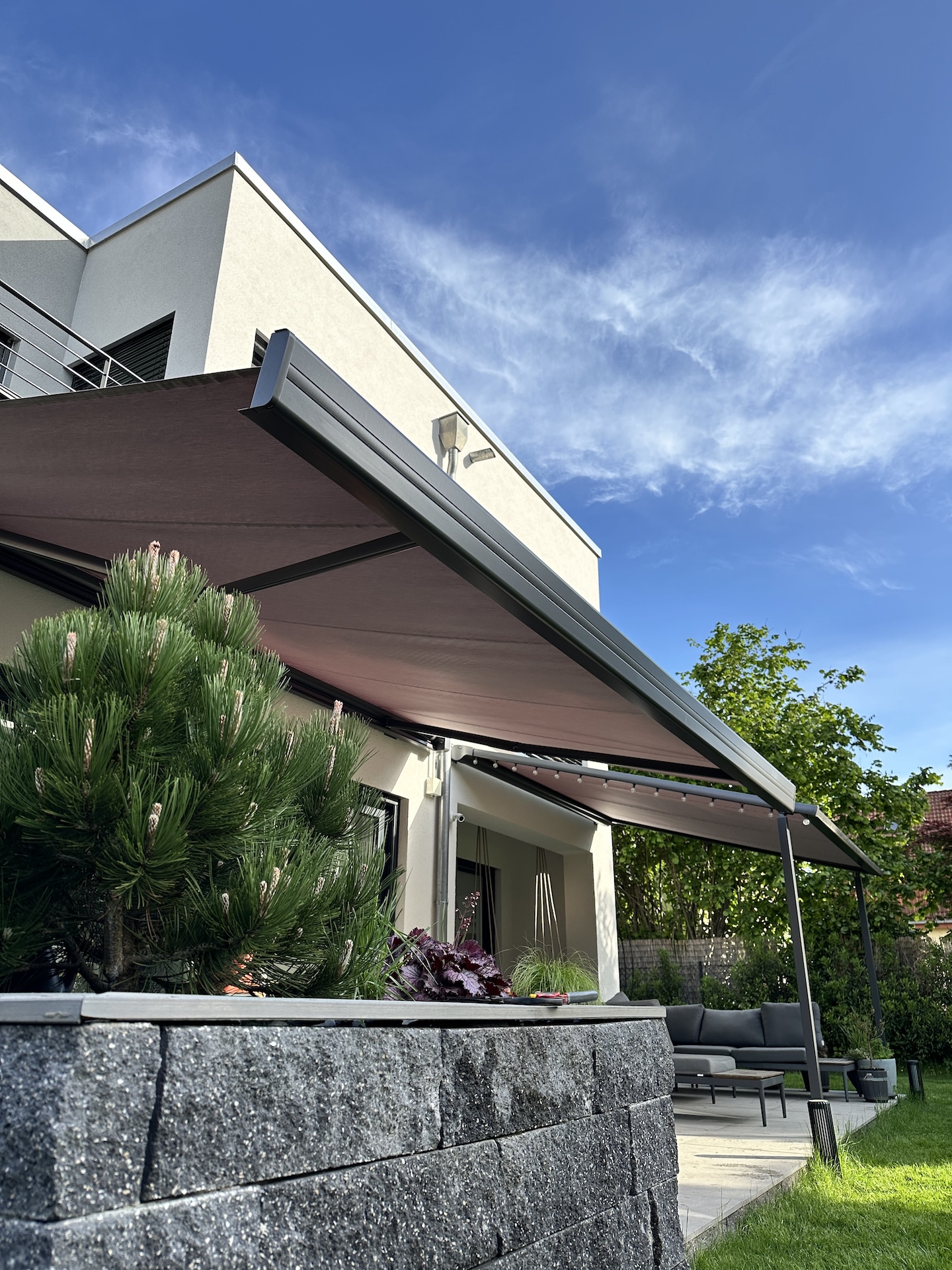 Im Rahmen der Umsetzung wurden zwei elektrisch betriebene Markise installiert, die sich komfortabel per Handsender oder Funksteuerung bedienen lassen. Die motorisierte Technik sorgt für eine einfache Handhabung und ermöglicht es, den Sonnenschutz jederzeit flexibel an die Wetterbedingungen anzupassen. Durch die individuelle Planung konnten die Markisen exakt auf die Terrassensituation abgestimmt werden – von der Breite über den Ausfall bis hin zur Auswahl des Markisentuchs. So entstand ein effektiver Sonnenschutz für zwei Terrassenbereiche, der den Wohnkomfort im Außenbereich deutlich erhöht.