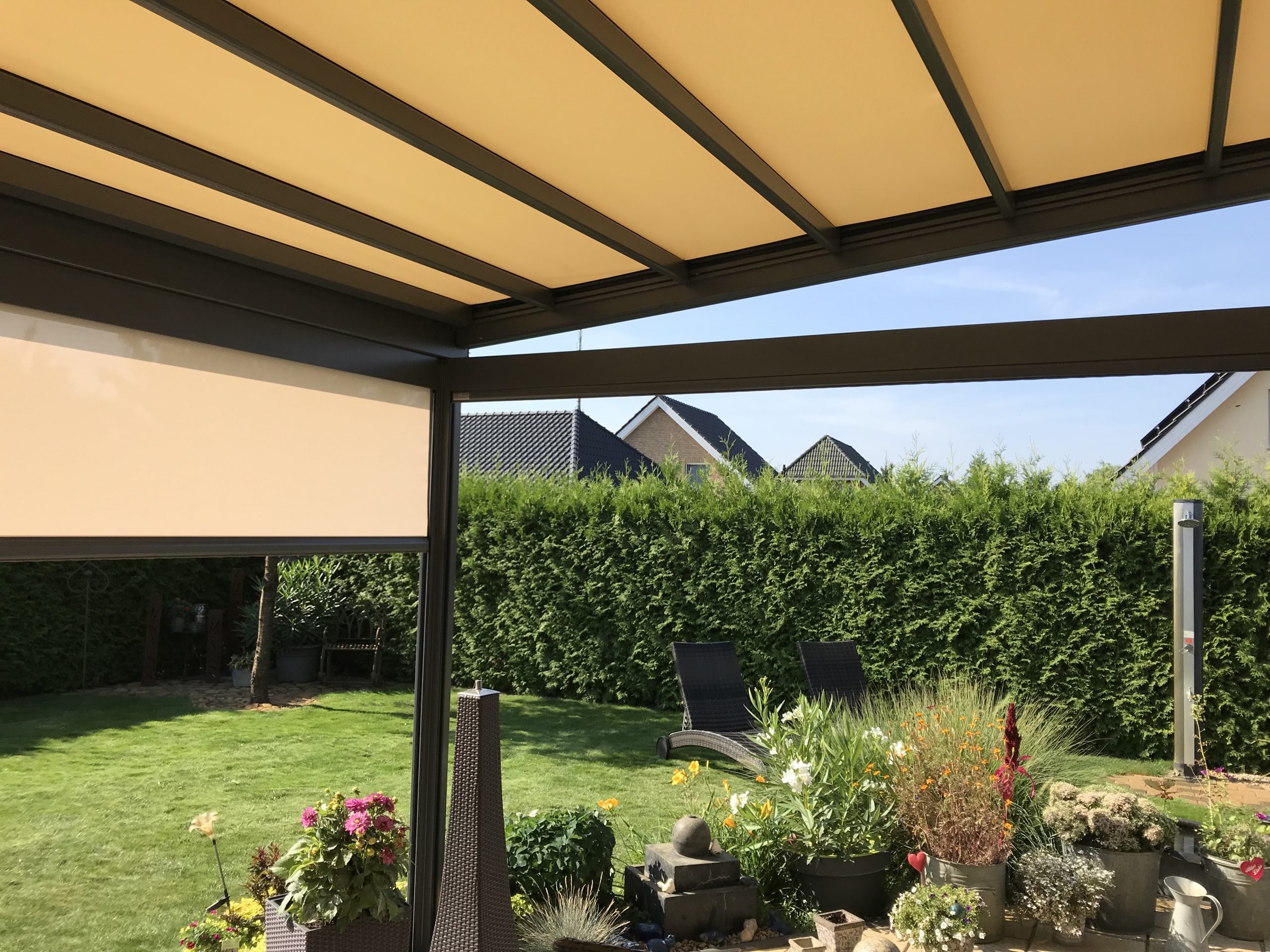 Die Pergola RIVERA P5000 bietet ein hohes Maß an Flexibilität, zuverlässigen Schutz vor schädlicher UV-Strahlung und beachtliche Kühlung. Bei Regen leitet das straff gespannte Resistant-Tuch das Wasser kontrolliert zum Ablaufsystem im Frontbereich. Eine große Auswahl an erweiterbaren Annehmlichkeiten und unzählige Tuch- und Farbkombinationen machen aus der RIVERA P5000 ein exklusives Terrassendach. Zum Beispiel bieten integrierbare Senkrechtbeschattungen zusätzlichen Sicht- und Blendschutz. Variable Schiebeverglasungen halten Wind und Regen ab. Und am Abend zaubert eine stromsparende LED-Beleuchtung auf Wunsch ein stimmungsvolles Ambiente.