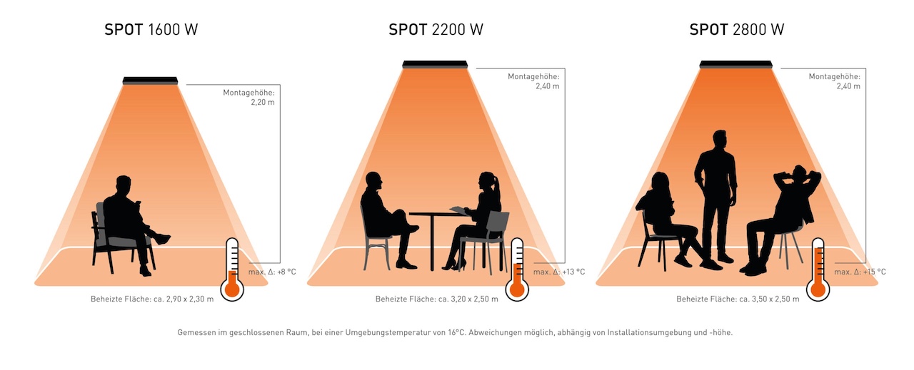 Die Wärmeverteilung des Modell Spot Powerstrahler hängt ganz von der Montagehöhe, der Umgebungs-temperatur und der Terrassenbegrenzung ab. Das heißt, prinzipiell kann Heatstrip™ auf einer 3-seitig geschlossenen Terrasse oder in einem Wintergarten mehr bewirken als in einem komplett geöffneten Bereich, der viel stärker dem Wind ausgesetzt ist. Obwohl die Zugluft keinen Einfluss auf die Infrarotstrahlen hat, ist dennoch die gefühlte Temperatur in ungeschützten Außenbereichen niedriger. Dort sollten zusätzliche Windschutzmaßnahmen ergriffen werden.